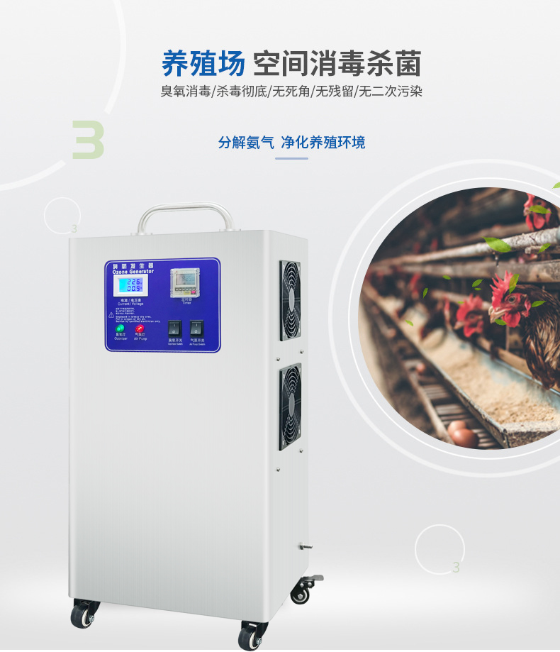 養殖專用臭氧發生器能夠去除雞、鴨、鵝、豬、馬、牛、羊、兔、鴿、珍禽、珍畜的惡臭,消毒滅菌降低死亡率,改善養殖環境,臭氧分解為氧氣無二次污染。去除豬舍氨氣、惡臭、削減呼吸疾病、進步肉產值、防備口蹄疫。